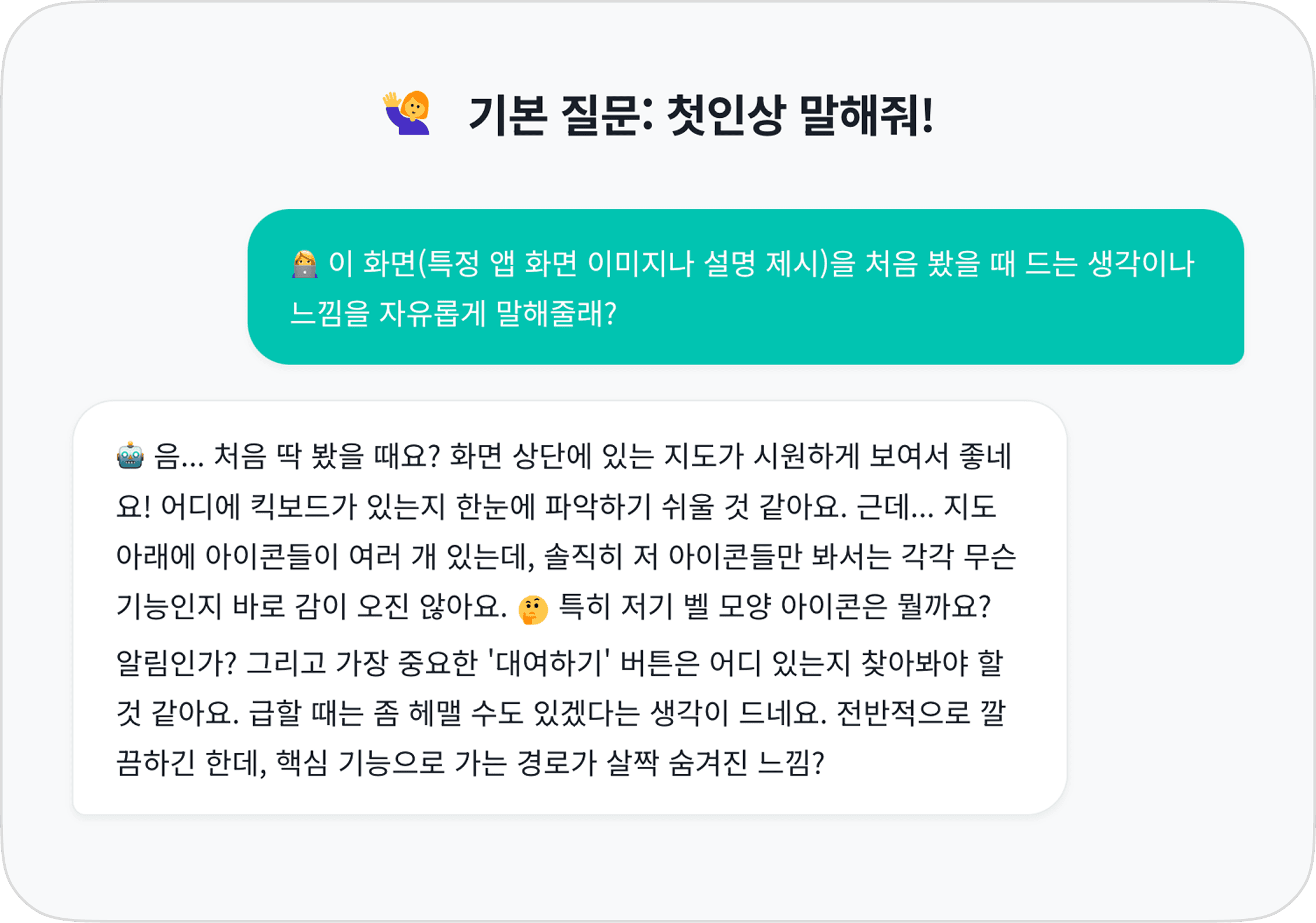 백문이 불여일견! 휴리스틱 어시스턴트가 실제로 어떻게 작동하는지 몇 가지 대화 예시를 통해 보여드릴게요. 기획자/디자이너(👩💻)가 질문하고, 휴리스틱 어시스턴트(🤖)가 답변하는 방식입니다.