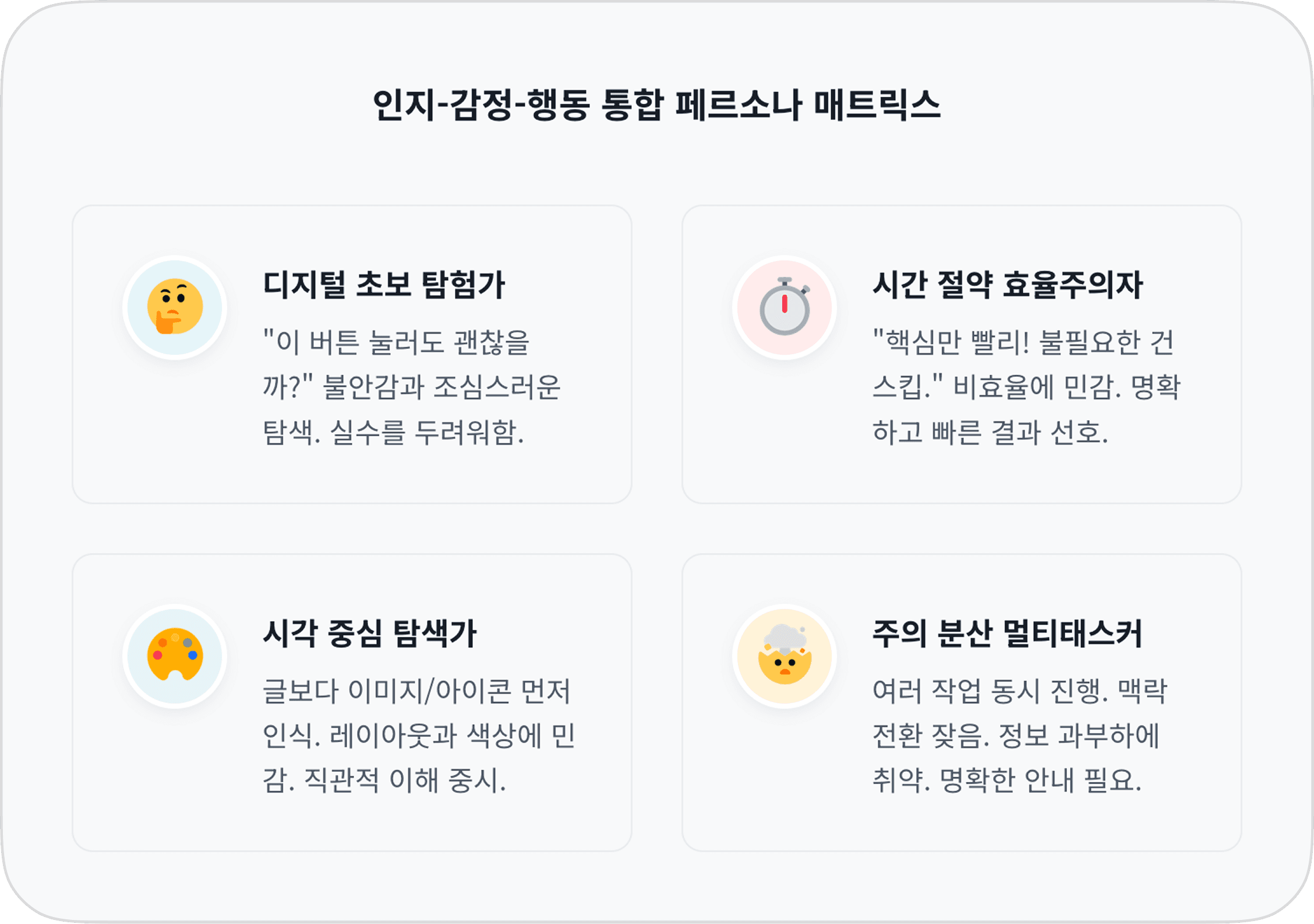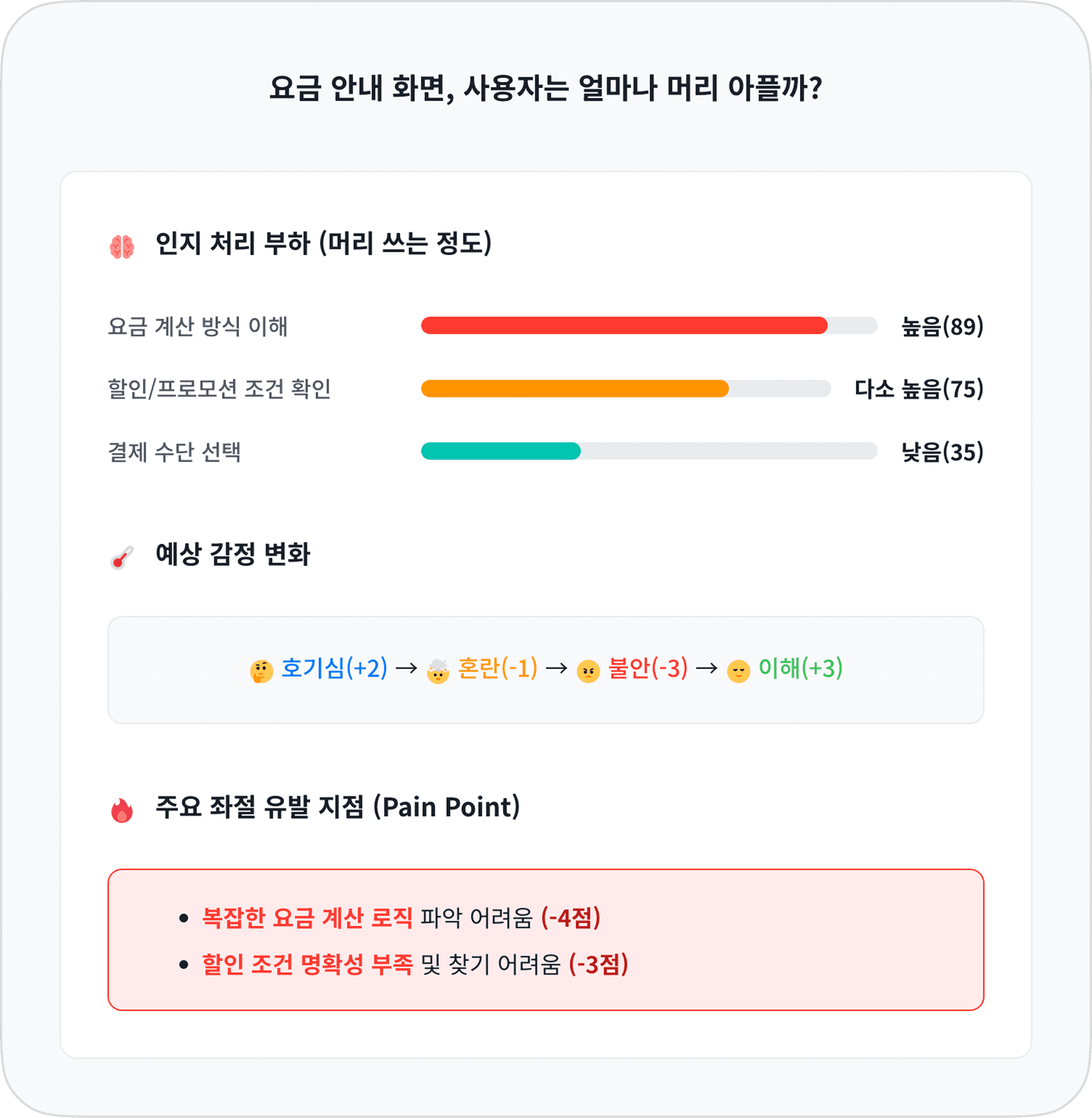 특정 화면이나 기능 단계가 사용자에게 얼마나 많은 정신적 노력(인지 부하)을 요구하고, 어떤 감정적 반응을 유발하는지 시각적으로 보여줍니다. 이 '인지-감정 맵'을 통해 기획자와 디자이너는 다음과 같은 질문에 대한 답을 명확하게 얻을 수 있습니다: