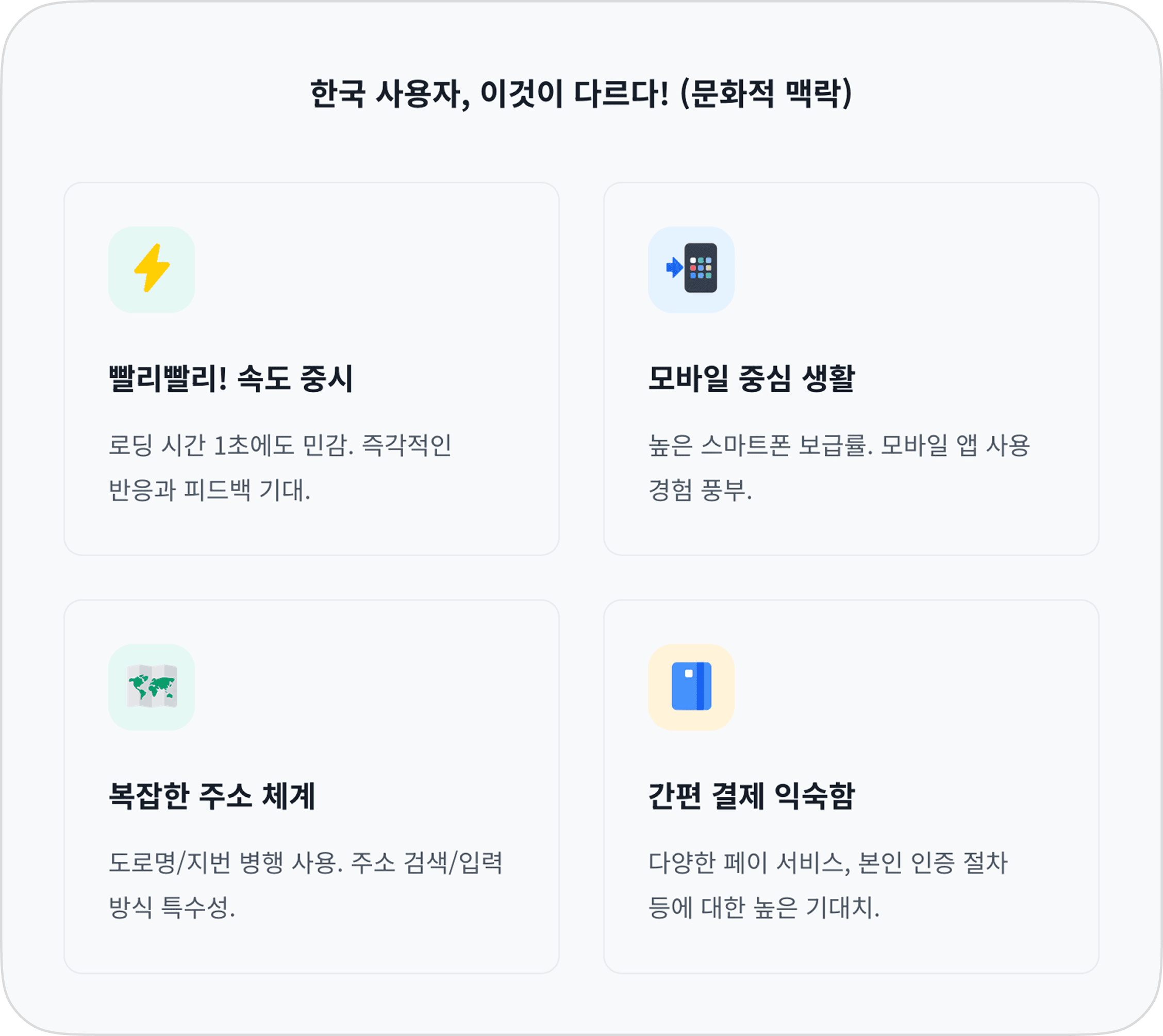 글로벌 UX 원칙도 중요하지만, 한국 사용자의 특수한 기대와 행동 패턴을 놓쳐선 안 됩니다. 휴리스틱 어시스턴트에는 한국 특유의 문화적, 기술적 맥락이 반영되어 있습니다: