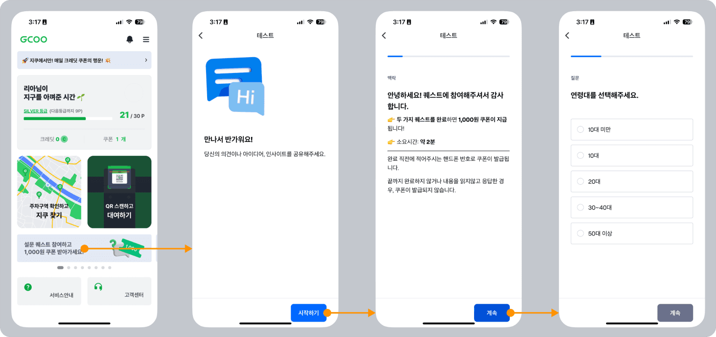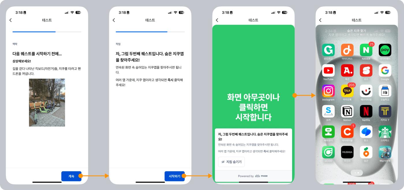 자연스러운 유저의 행동을 이끌어 내야 정확한 테스트 결과를 볼 수 있습니다. 그래서 기존 유저가 지쿠를 타기 위해 길에서 앱을 열어야 할 때의 상황을 연출하는 방식으로 테스트를 진행했습니다.