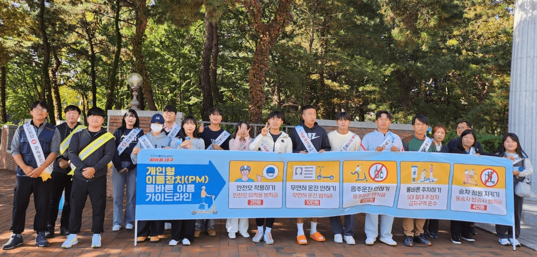 대구광역시는 10월 31일, 11월 2일 두 차례에 걸쳐 계명대학교, 경북대학교에서 진행되었으며 대구시 교통정책과, 도로교통공단, 녹색어머니회, 계명대 총학생회, 경북대 총학생회, 지쿠(GCOO)를 비롯한 공유 PM 업체에서 함께 참석했다. 공유 PM의 주요 고객층인 대학생들을 대상으로 개인형 이동장치(전동킥보드)의 올바른 이용 가이드라인을 홍보하며, 보행 안전성 제고를 위해 민원 다수 발생 지역을 반납 금지 구역으로 설정, 무분별하게 주차된 PM을 정돈하는 작업 등을 수행했다.