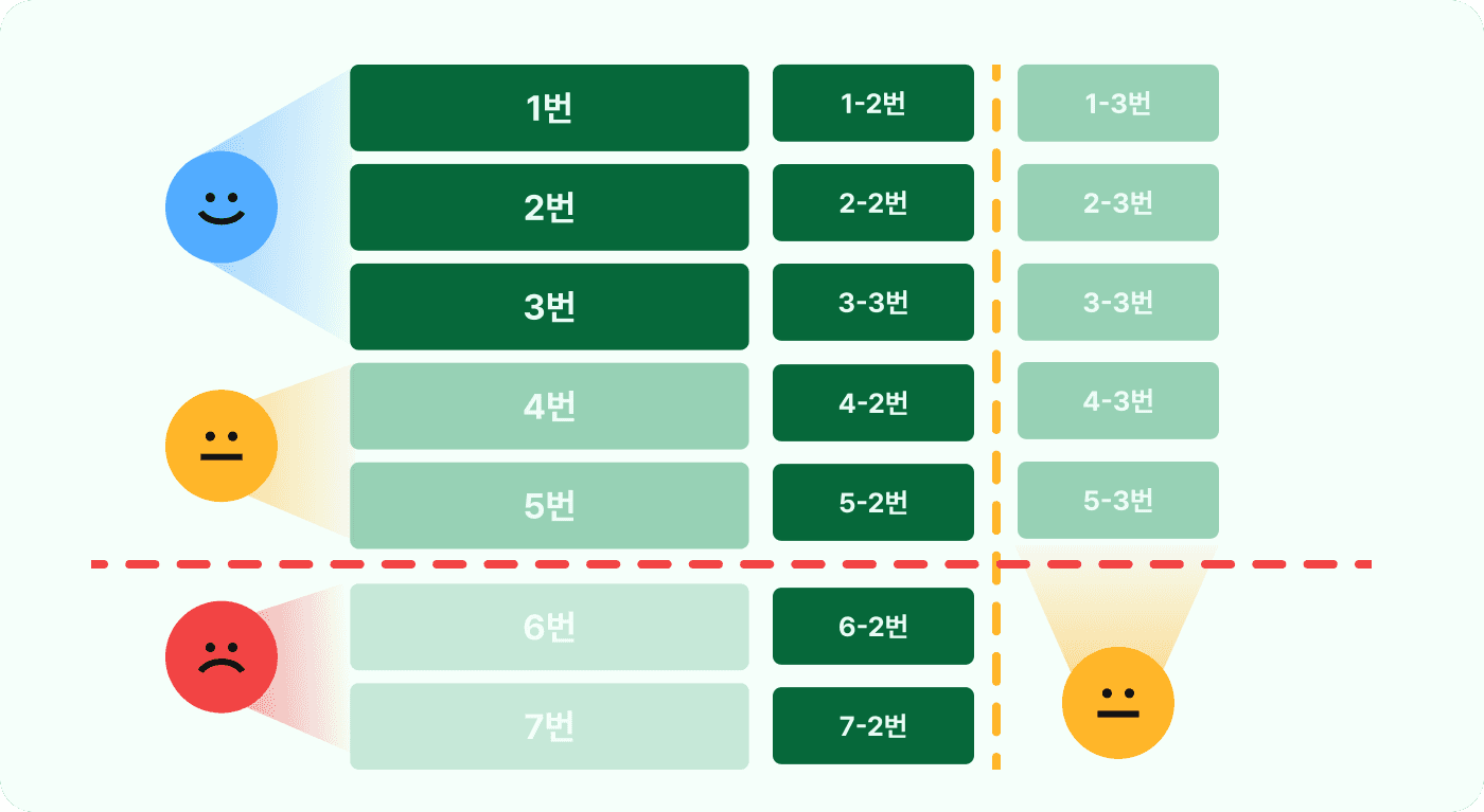 특히 1-3번까지의 집중도가 제일 좋았는데요. 이를 활용해 뒷번호(4-5)에는 상담 연결 없이 해결 가능한 메뉴를 배치하여 상담이 꼭 필요한 고객이 대기하지 않고 자동 소팅될 수 있는 구조를 설계했습니다.