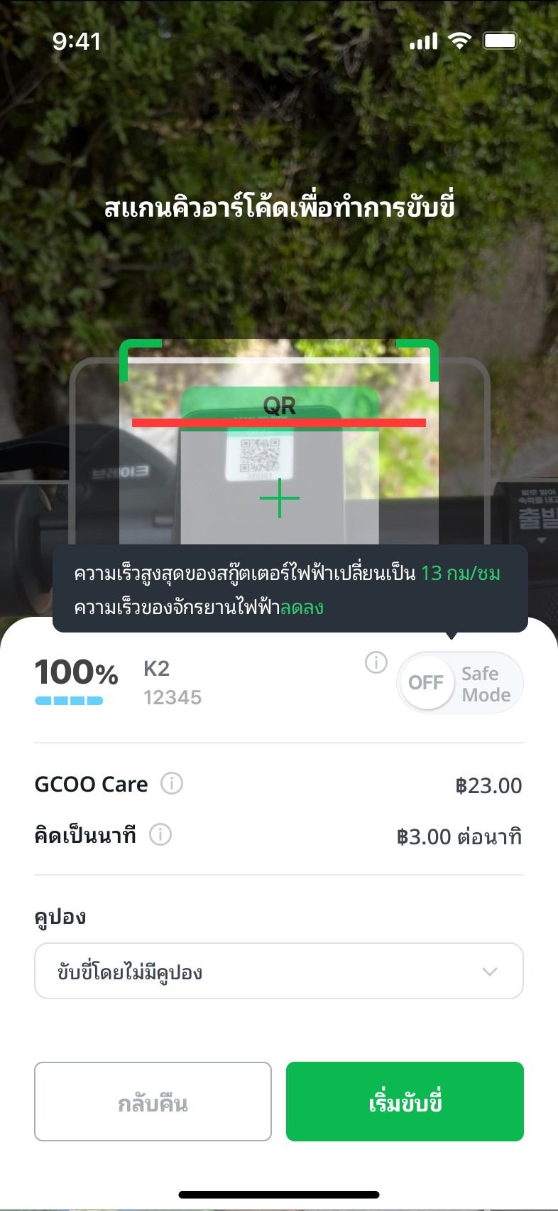 ด้วยโหมดความปลอดภัยและ GCOO CARE แม้แต่มือใหม่ก็ไม่ต้องกังวล ไม่ต้องรีบร้อน, คุณสามารถคำนวณค่าบริการตามระยะทางที่ใช้ เพื่อเป็นการประหยัดค่าใช้จ่าย!